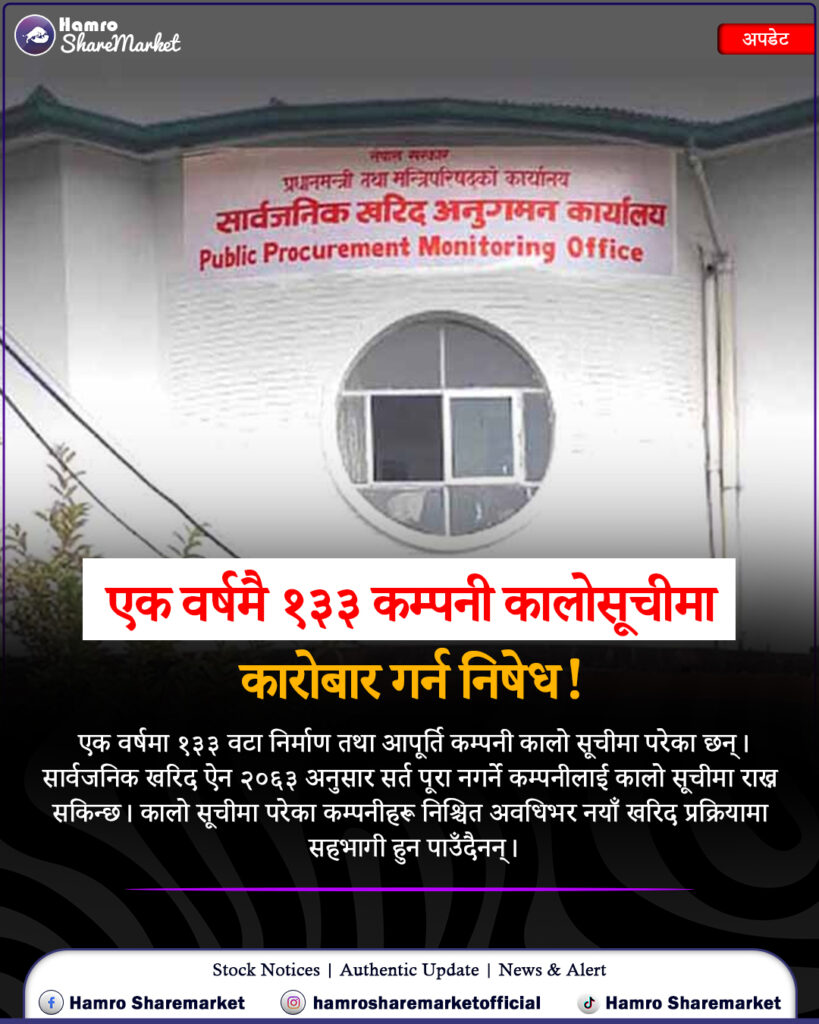 नेपाल सरकार अन्तर्गतका विभिन्न नियामक निकायले २०७९/८० देखि २०८०/८१ सम्मको एक वर्षको अवधिमा १३३ कम्पनीलाई कालोसूचीमा राखेको छ। यी कम्पनीहरूलाई नियम उल्लंघन, कर छली, ठेक्का सम्झौता तोडफोड लगायतका कारणले सरकारी कारोबारमा सहभागी हुन प्रतिबन्धित गरिएको हो।