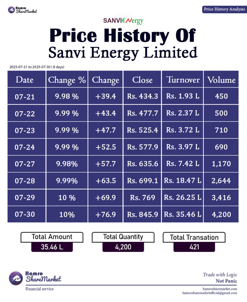 Sanvi Energy Limited का शेयरले नेपाली शेयर बजारमा हालसालै ठूलो हलचल ल्याएको छ। जुलाई २१ देखि ३० (१० कारोबार दिन) सम्म लगातार वृद्धि हुँदै आएको यो शेयर आज (जुलाई ३०) रु. ८४५ को नयाँ उच्च मूल्यसम्म पुगेको छ, जसले बजारमा ‘आगो’ नै लगाइदिएको छ।