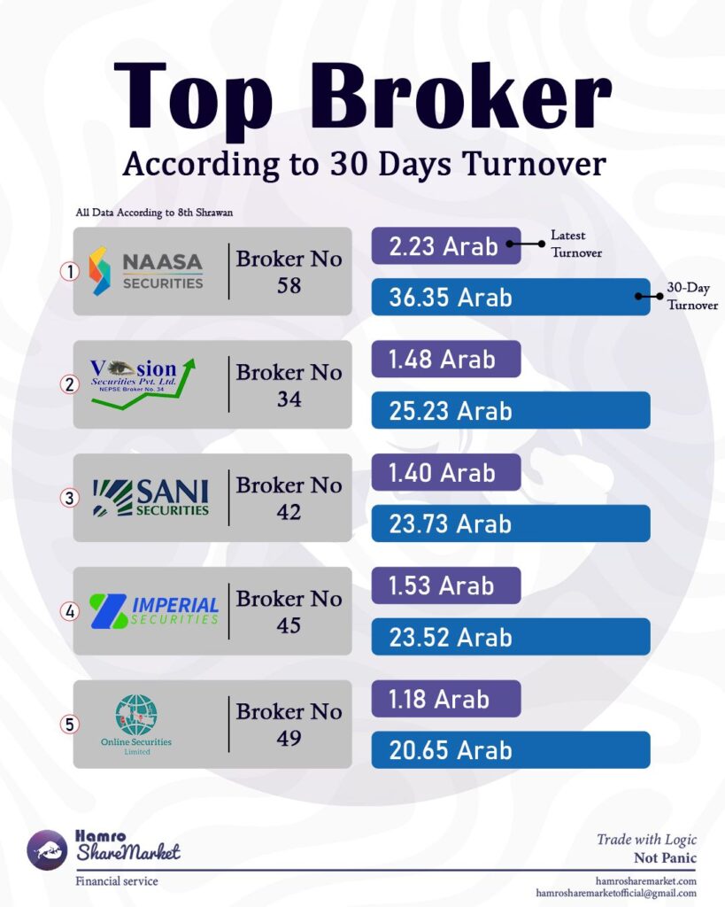 Are you wondering which stock brokers are leading the Nepali share market recently? According to the latest data, here are the Top 5 Brokers ranked by their 30-day turnover, showcasing their active performance in NEPSE.