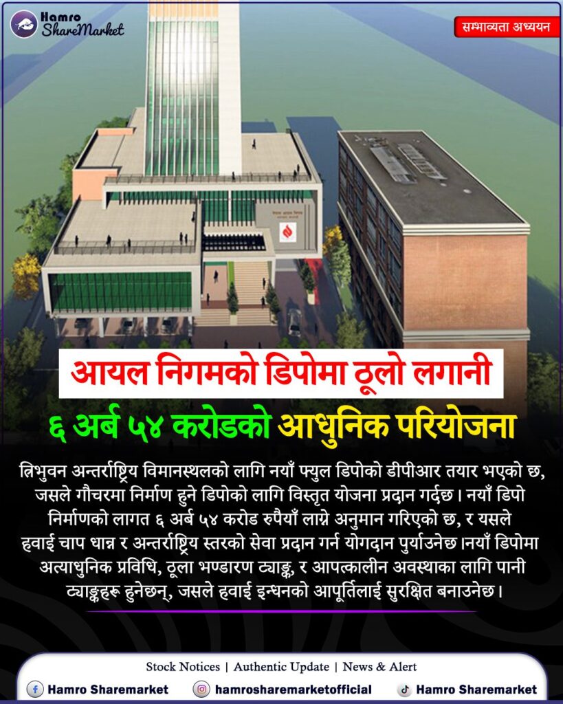नेपाल आयल निगमले त्रिभुवन अन्तर्राष्ट्रिय विमानस्थलमा ६ अर्ब ५४ करोड रुपैयाँको लागतमा अत्याधुनिक हवाई इन्धन डिपो निर्माण गर्न लागिएको छ।